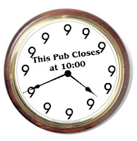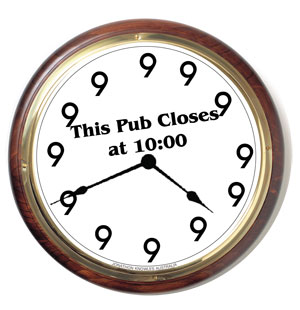 Of course you can always ask the bar staff when they plan to stop serving, but that might not be so easy if the pub is busy and, in any case, surely the pub should make it obvious without expecting people to ask. So might it not be a good idea for pubs to display clearly, possibly by a little clock face mounted above the bar, when they are actually going to shut up shop, so that customers know exactly where they stand?