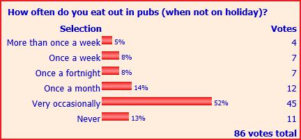 So, in view of this so-called pub food revolution, I thought I would ask blog readers how often they ate out in pubs in their daily lives when not on holiday. The results didn’t really bear out the received wisdom, with 65% replying either “very occasionally” or “never”, and only 13% saying they did it at least weekly. Even accepting that there is a proportion of smoking ban refuseniks, these results certainly don’t show a huge enthusiasm for eating in pubs from a population who typically probably visit pubs more than average.